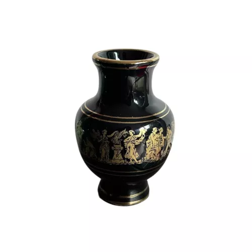 Les motifs dorés qui ornent la surface rappellent la richesse artistique des cités grecques, tandis que sa petite taille permet de l’intégrer facilement à toute décoration intérieure. Sur une console, une étagère ou au centre d’une table, il attire immédiatement le regard par son éclat doré et sa patine délicate.