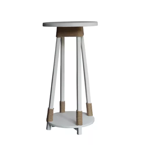 Il peut adopter plusieurs rôles : table d’appoint, guéridon de lampadaire, support décoratif. Dans un intérieur lumineux, le blanc sera en écho à d’autres éléments clairs. Dans une pièce plus sombre, la touche blanche plus la corde apportent contraste et chaleur.
